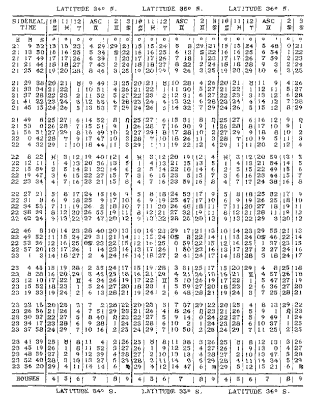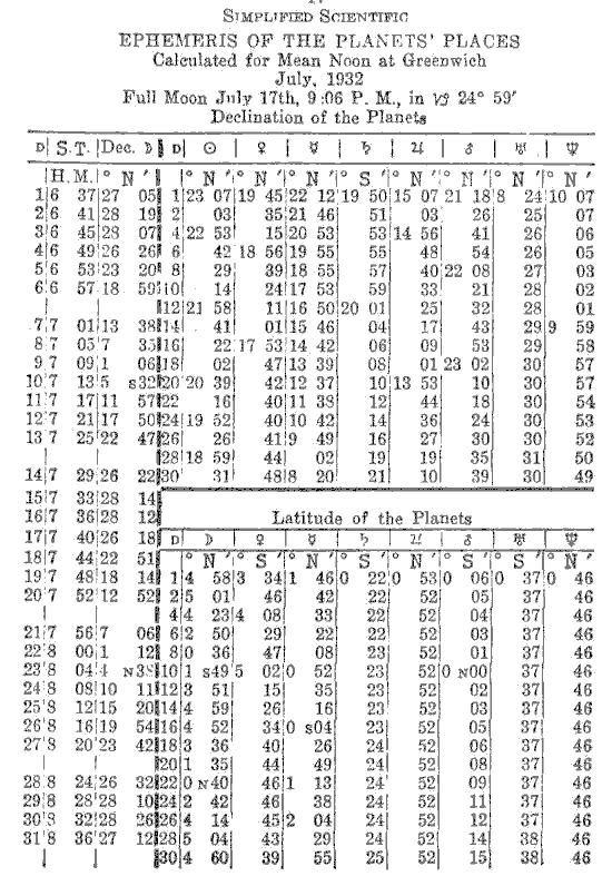 The following tables are the longitudes of the planets, the declinations of same and the sign, degree and minute to be placed on the necessary six houses in order to erect the horoscope of a male, born July 4, 1932; 2:15 A.M., Standard Time, Los Angels, California. (optional)