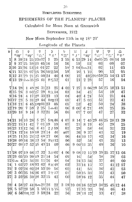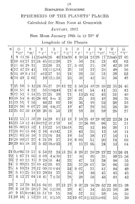 Now suppose that the Moon is in Aries 26 at one noon and moves to Taurus 8 by the next noon, and you wish to find out how far she has gone. You wish to subtract Aries 26 from Taurus 8 thus: