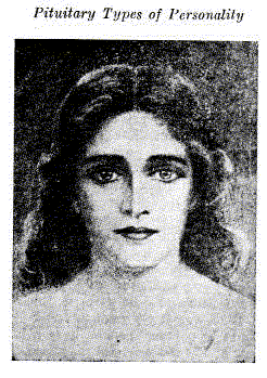 The pituitary body is a feminine-masculine gland. The feminine pituitary type is dominated by the post-pituitary lobe of the gland. The masculine type is dominated by the anterior lobe of the pituitary. The feminine pituitary type expresses tender emotions and refined sentiments. The skin is soft, moist, roseate, or creamy, hairless, and flushes easily; the brow are high, the eyes are large and prominent. These people are fond of children, and are in every way most womanly. They are of medium height, well-formed, medium- sized hands and feet, well modulated voice, fond of good poetry and music, and have a sensitive face; are much interested in the welfare of mankind. They are womanly with a suggestion of masculine force. mary, the mother of Jesus, is a good example of well-balanced feminine pituitary type. Florence Nightingale also belongs to this class.