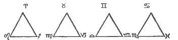 Planets in fiery signs are in conjunction or trine if within orb. Planets in earthy signs are in trine (or conjunction); so are the planets in airy or watery signs, as shown in the above diagram.